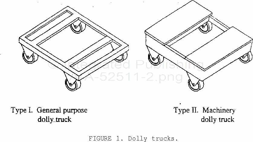 2.2 Design and construction. The dolly trucks shall consist of a rectangular frame and four swivel casters as shown in figure 1. The type II dolly trucks shall have two platform boards attached to the frame. Frame material shall be wood or steel for type I dolly trucks and steel for type II. Steel frames shall be of an all welded construction. The capacities and sizes of the trucks shall be as shown in table I.